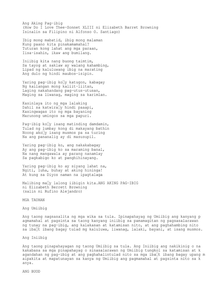 Buod nfsonnet xliil isinalin sa filipino ni alfonso o.santiago. Maaaring gawin pong profile picture o cover page ang. ANG AKING PAG IBIG isinalin ni Alfonso O. Lulan nito ang maraming taong papunta sa Laguna.
